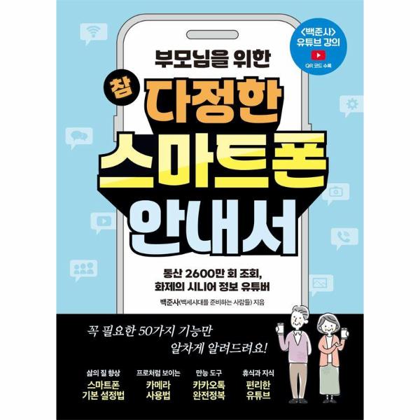‘부모님을 위한 참 다정한 스마트폰 안내서’는 알아두면 삶의 질이 높아지는 50가지 스마트폰 지식을 참 다정하게 알려주는 안내서입니다. 별 것 아닌 것 같은데 조금 까다로운 정보를 한 단계씩 서두르지 않고 알려줍니다. 그리고 짜증을 내지도 않죠. 몇 번을 돌려서 봐도 됩니다. 그래도 조금 이해가 가지 않을 때는 책 내용과 함께 있는 ‘QR 코드’를 스마트폰 카메라로 비추어 보세요. 그러면 화제의 유튜버 ‘백준사’의 강의로 바로 연결되니 확실히 알 수 있게 됩니다.