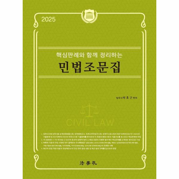2.각 조문마다 ① 의 의(개념 ② 요건과 효과의 압축적 정리 ③ 해당 조문의 이해에 필수적인 핵심판례를 소개하는 방식으로 구성함으로써 민법 조문을 체계적으로 이해할 수 있도록 최