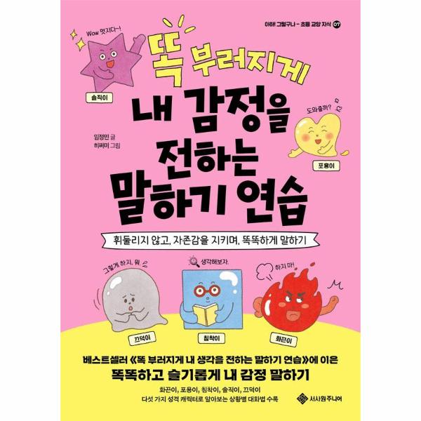 친구들이 단톡방에서 나만 소외시킬 때, 친구가 절교 선언을 할 때, 부모님이 나에게만 양보하라고 할 때, 새 학기 자기소개를 해야 할 때… ‘이럴 땐 뭐라고 말해야 하지?’ 고민되는 순간들이 많지요. ‘화끈이, 포용이, 침착이, 솔직이, 끄덕이’ 다섯 가지 성격 캐릭터 중, 상황별로 적절한 캐릭터를 선택해서 하고 싶은 말을 보다 효과적으로 전하는 연습을 해보세요. 예를 들어 누군가 무례한 태도를 보이면 단호한 화끈이, 공감이 필요한 친구에게는 배려하는 포용이, 내 감정을 전달해야 할 때는 표현하는 솔직이가 되어 말하는 거예요. 무조건 친절하고 예쁘게 말하는 것만이 항상 정답은 아니라는 걸 기억해요!