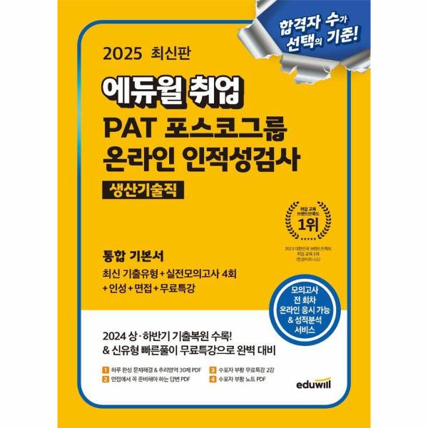2024년 4월, 9월 채용을 통해 시행된 PAT 온라인 인적성검사 실제 기출 키워드를 일부 복원하여 최신 유형이 반영된 기출복원 문제를 수록하였습니다. 본격적인 학습에 앞서 실력을 가늠해 보고 온라인 PAT의 출제 유형을 살펴볼 수 있습니다.