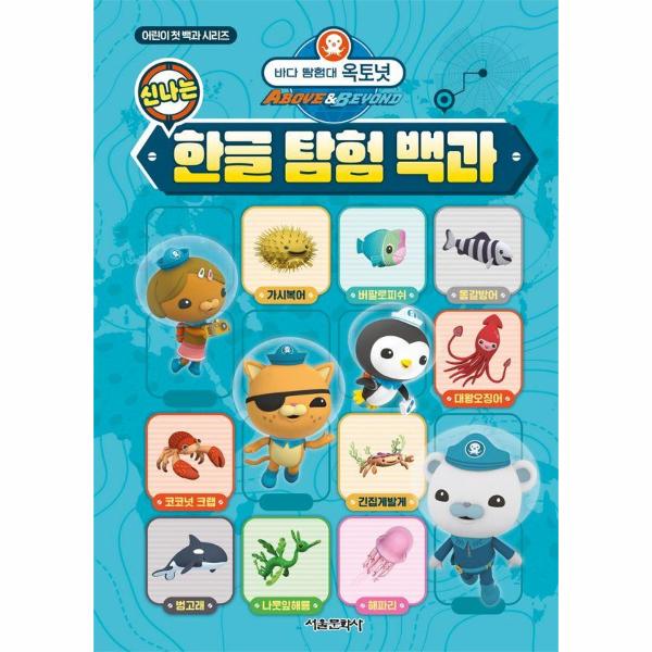 <바다 탐험대 옥토넛 신나는 한글 탐험 백과>는 한글 학습과 동물 탐험 퀴즈 놀이를 한 번에 즐길 수 있는 책으로 한글을 처음 배우는 아이들이 자연스럽게 글자를 익히면서 <바다 탐험대 옥토넛>에 등장하는 다양한 동물들도 만나볼 수 있도록 구성되어 있어요.