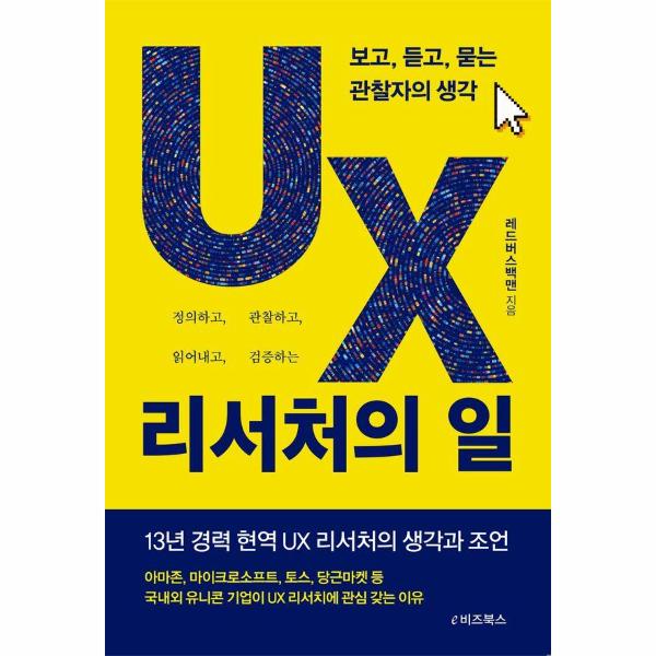 사용자 경험을 의미하는 UX(User Experience는 사용자가 제품을 경험하는 여러 단계와 여정을 분석하고 발견한 문제들을 개선하는 분야로, 현재는 디자인, 리서치, 라이팅, 시스템 등으로 세분화·전문화되고 있다. 그중 제품 또는 서비스의 설계 및 개발을 위해 사용자, 사용자의 행동, 요구 및 선호도를 이해하는 체계적인 접근 방식을 말하는 UX 리서치에 대한 수요는 2020년대에 접어들면서 점점 높아지고 있다. 이 책은 아마존과 마이크로소프트, 메타와 토스, 당근마켓 등 국내외 유니콘 기업이 UX 리서처의 채용을 늘리는 이유, UX 리서치를 해야 하는 이유, UX 리서처가 제품의 완성도를 높이는 데 어떤 기여를 하고 어떤 방식으로 문제를 풀어가는지 설명한다.