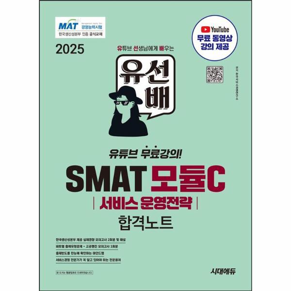 한국생산성본부에서 주관하는 국가공인 자격시험 SMAT(서비스경영자격은 급증하는 인력수요를 보이는 서비스 산업의 핵심 성공요인을 선별하여 서비스 직무의 현업 지식 및 역량을 평가하는 실무형 자격시험입니다. Module C 서비스 운영전략은 서비스 현장에서 CSM 및 HRM에 대한 이해를 바탕으로 우수한 서비스 프로세스를 설계하고 공급/수요를 관리할 수 있는 서비스 운영전략 관리자 양성을 목적으로 하기에 그 중요성이 크다고 할 수 있습니다. 이러한 SMAT의 철학을 담아, 현장에서 전문적이고 유용하게 쓰이는 서비스 실무형 이론에 대한 생생한 이해가 가능하도록 제작하였습니다. 또한 무료 동영상 강의를 제공하여 혼자 학습하는 수험생도 합격하는 데 무리가 없도록 구성하였습니다.