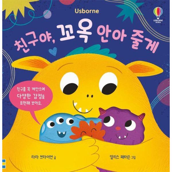 폭신폭신 노랑이는 꼬옥 껴안는 걸 무척 좋아해요. 친구들은 기쁠 때나 슬플 때 언제라도 노랑이를 찾지요. 초록이가 즐겁게 인사하면 노랑이가 반갑게 안아 주어요. 벌레에 겁을 먹은 빨강이도 노랑이가 안아 주면 마음이 편안해지고요. 아이스크림을 떨어뜨리고 울던 보라도 노랑이가 안아 주면 기분이 나아져요. 이제, 알록달록 친구들이 모두 모여 노랑이를 꼬옥 안아 주어요. 꼭 껴안으면 서로의 마음을 더 잘 느낄 수 있으니까요. “친구야, 정말 고마워! 사랑해!”