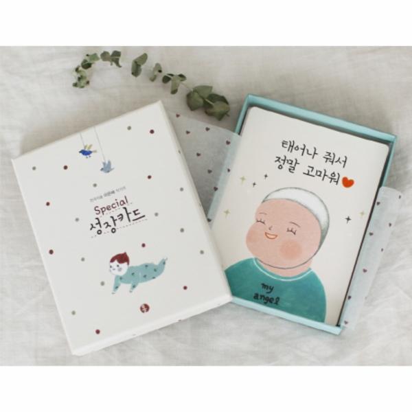 아가의 소중한 모든 순간들을 담을 수 있도록 엄마 마음으로 시간을 두고 한 컷 한 컷 정성껏 그림을 그려 준비한 [천국의숲 이은혜 작가의 Special 성장카드(생후 1년]는 모든 카드를 친환경 콩기름으로 인쇄하고 모서리가 라운딩 처리가 되어 있어 아가의 건강부터 생각한다. 카드를 보관하는 케이스조차 스킨 코팅으로 특수 처리가 되어 있어 만지면 부드러운 촉감을 느낄 수 있고, 소중한 순간을 성장카드 뒷면에 손편지로 기록하고 부드럽고 예쁜 상자에 오래 간직할 수 있어 남다르다. 출산을 앞둔 주변의 사람들에게 선물하기에도 손색이 없어 각 가정마다 세상에 하나뿐인 소중한 순간들을 담을 수 있는 행복한 선물이 되어줄 것이다.